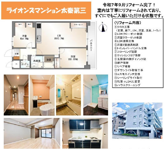 ☆ライオンズマンション太秦第3☆嵐電太秦広隆寺駅まで徒歩9分・地下鉄太秦天神川駅まで徒歩14分の中古マンションです。5階建2階部分・令和7年9月リフォーム済・リフォーム履歴の詳細は図面をご参照ください・東向きバルコニーにつき陽当たり良好です・交通量の多い大通りから少し中側に位置してるので、全体的に静かで陽当りの良いマンションです♪京都民医連中央病院まで約20m、コンビニローソン太秦荒木町店まで徒歩1分、スーパーフレスコ太秦店まで徒歩3分、スーパー新鮮市場太秦店まで徒歩3分、スギ薬局太秦店まで徒歩2分、ファミリーマート太秦小学校前店まで4分、サンドラッグ太秦店まで徒歩5分で生活施設・買い物充実してます♪現況空室につき即内覧・即ご入居可能!