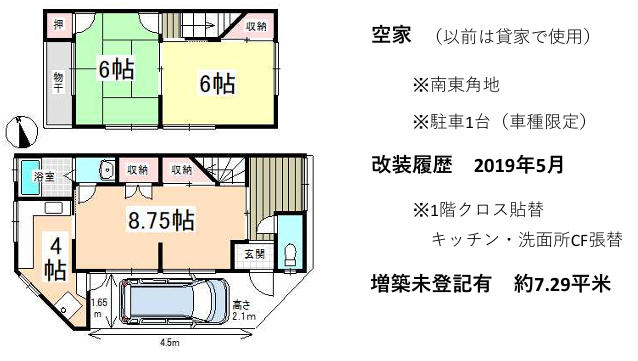 | 特色 | 公営水道、公共本下水、都市ガス、駐車場付、南東道路、即入居可、増築未登記部分有(約7.29㎡)改装履歴有 |