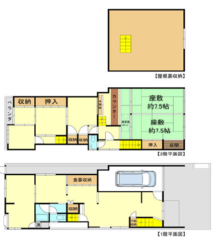 | 特色 | 公営水道、公共本下水、都市ガス、駐車場付、1BOX車2台駐車可能、天井収納庫付! |