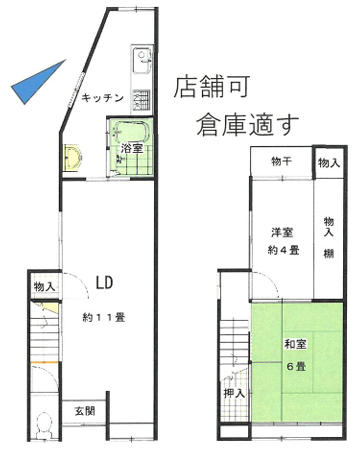| 特色 | 公営水道、公共本下水、都市ガス、即入居可、店舗可・倉庫適す |