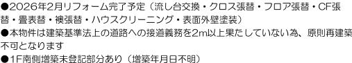 | 特色 | 公営水道、公共本下水、都市ガス、即入居可、2026年2月中旬リフォーム完了予定・再建築不可・増築未登記部分有 |
