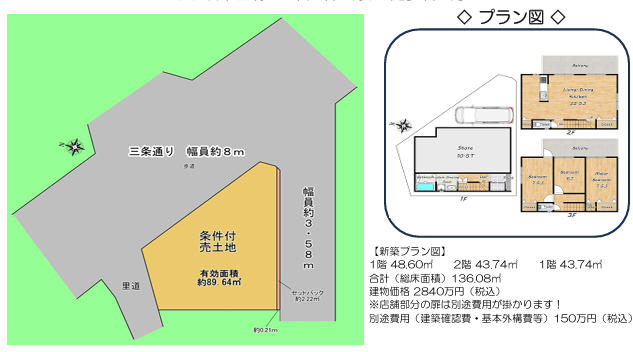 | 特色 | 都市ガス、公営水道、公共本下水、南道路、北東角地、建築条件付、新築プラン有 |
