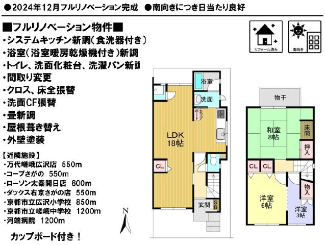 南向きにつき陽当たり良好・2024年12月フルリノベーション完成・フルリノベーションの詳細は図面をご参照ください!スーパー万代嵯峨広沢店まで徒歩7分、コープさがの店まで徒歩7分、ウエルシアダックス右京さがの店まで徒歩7分、リカーマウンテン嵯峨野店まで徒歩6分、ファミリーマート京都嵯峨広沢店まで徒歩7分、ローソン太秦開日町店まで徒歩8分、スーパーいかりライクス常盤店まで徒歩10分、京都広沢郵便局まで徒歩2分、キリン堂新丸太町店まで徒歩9分、ケーヨーデーツー嵯峨店まで徒歩11分、京都中央信用金庫常盤支店まで徒歩8分、京都信用金庫常盤支店まで徒歩8分、河端病院まで徒歩15分で生活施設・買い物充実してます♪現況空き家につき即内覧・即ご入居可能!