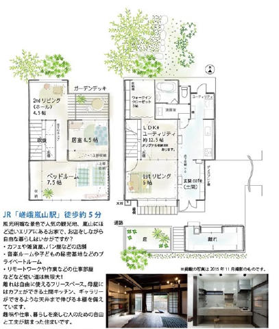 | 1BOX車2台駐車可能・ウッドデッキ有・陽当たり・通風良好!グルメシティ嵯峨店約780m、フレスコにっさん嵯峨店約1200m、ローソン嵯峨釈迦堂門前店約600m、ファミリーマート嵯峨嵐山駅北口店約750m、ウエルシアダックス右京嵯峨店約1100m、京都中央信用金庫嵐山支店約1100m、京都銀行嵯峨支店約1200m、京都愛宕郵便局約570m! |