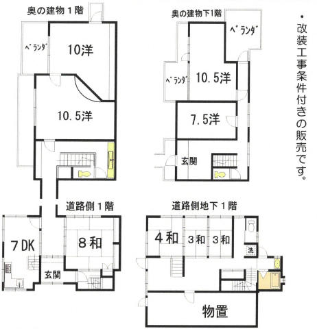 | 特色 | 公営水道、公共本下水、都市ガス、駐車場付、駐車スペース複数台駐車可、建物傾き有・2軒とも建築確認を受けてません、即入居可、駐車2台以上可能、改装工事条件付・建物傾きあり・建物は建築確認を受けていません |