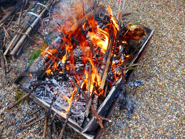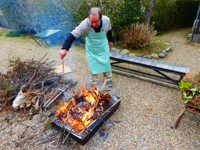 薪の材料は昨年から農家の方が、農作業中に溜められてきた木材や竹を十分乾燥されておられるので良く燃えてます。